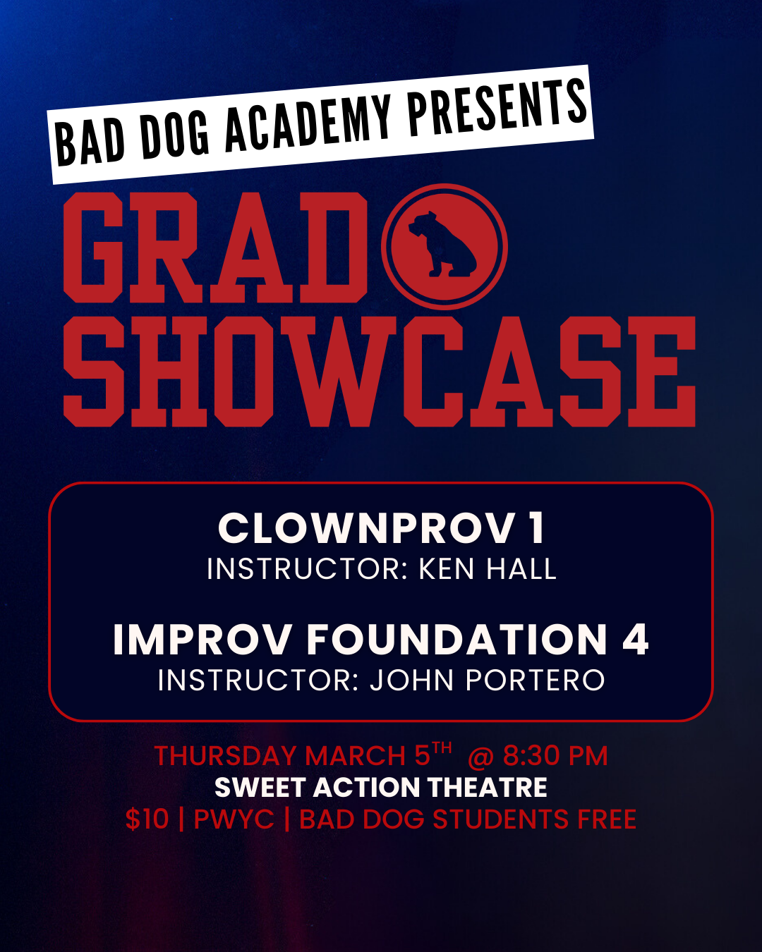 This brilliant showcase features performances by Ken Hall's Clownprov 1 and John Portero's Improv Foundation 4 Graduating Classes!